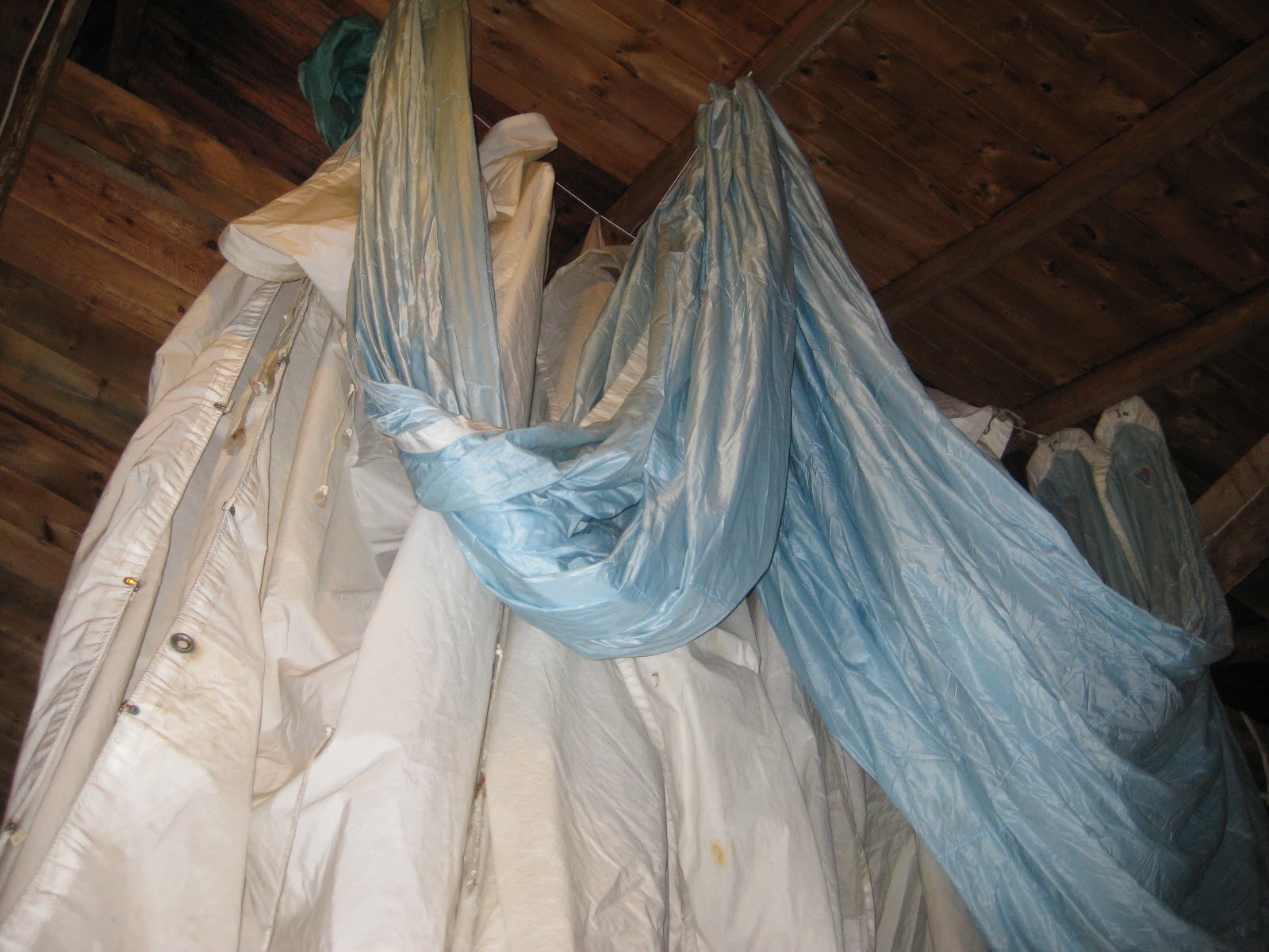 As you might notice, my car is absolutely STUFFED with sails and cushions from the boat. The idea was to get them off the boat to get them dried out, but also so that I could have some space to work in the cabin with out competing with the cushions and sails. I also had the opportunity to hang them up in my parents barn to let them air out. While I was hanging them, I got to check them over, and they are in great shape. One jib (the front sail, also referred to as a head sail) has a small hole in it, but other than that, they look great! Plus, this will give me an opportunity to learn how to patch the sails, which is an important skill to have. Here's the new sail loft!
